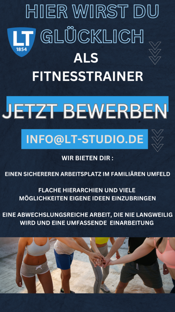 Du hast eine Groupfitness-Ausbildung und Lust, Deinen eigenen Kurs zu gestalten? Unser Faszien-Kurs dienstags um 18:00Uhr und unser Body-Fit-Kurs freitags 18:00Uhr suchen neue Trainer. Dich erwarten tolle, motivierte Teilnehmer. Jetzt bewerben! info@lt-studio.de. Wir freuen uns auf Dich!